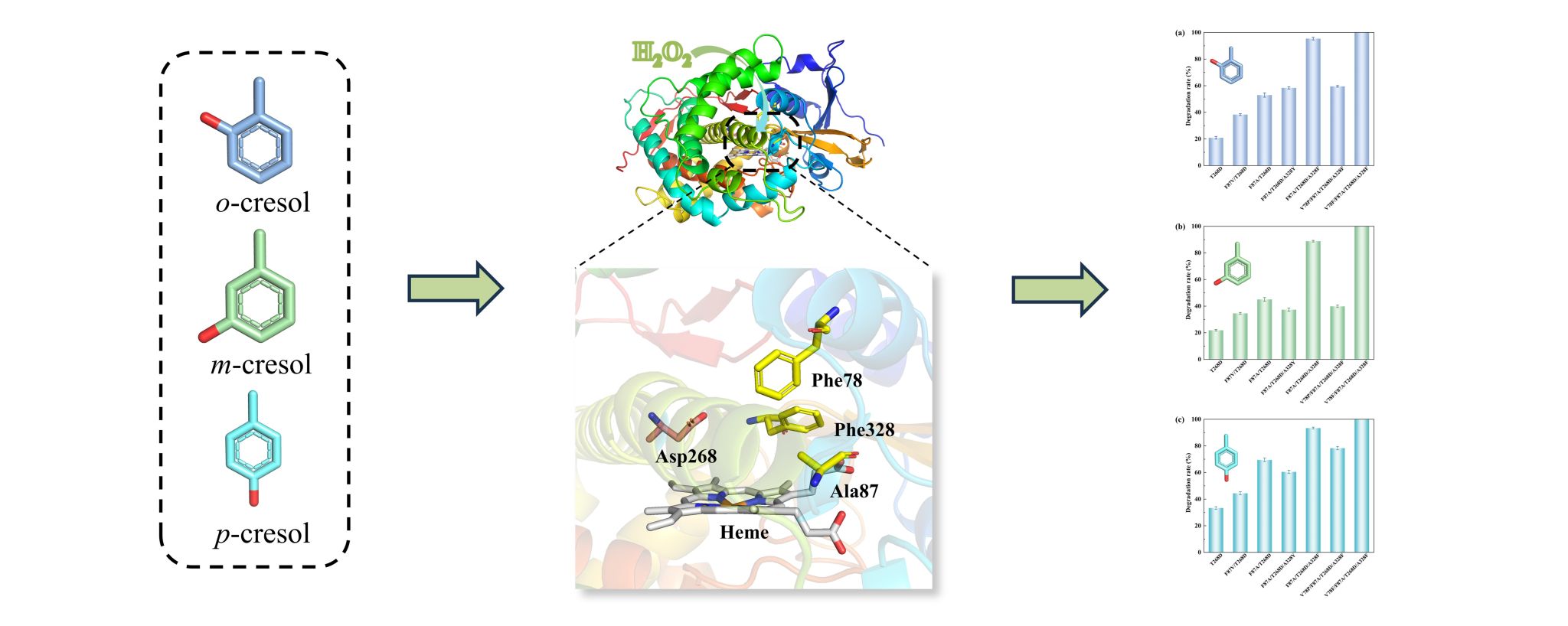 研究团队结合计算机模拟与基因工程手段,理性设计并构建了一系列基于细胞色素P450BM3的新型人工生物酶。在无需昂贵外源NAD(P)H及复杂电子传递体系的条件下,该类新型人工生物酶可直接以H₂O₂作为氧化剂,实现对三种甲酚异构体的高效降解,其降解率在2分钟内即可达到100%。该生物催化体系构造简单、反应高效且具备良好的经济可行性,不仅拓展了P450酶功能重构与理性设计的研究思路,也为酚类污染物的绿色生物降解提供了新的技术路径。