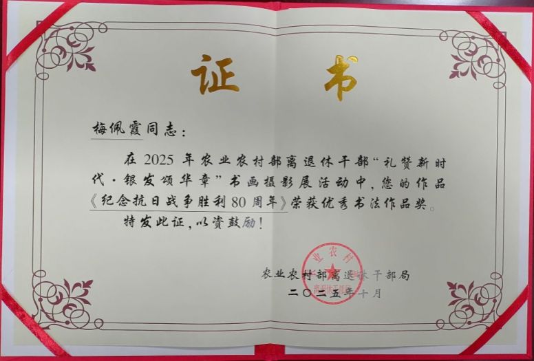 近日,农业农村部离退休干部局组织举办了部系统“礼赞新时代·银发颂华章”书画摄影展,旨在弘扬伟大抗战精神、增强民族自豪感、讴歌农业农村新发展新变化。中国水产科学研究院黄海水产研究所报送的退休干部梅佩霞行草书法作品《纪念抗日战争胜利80周年》荣获优秀书法作品奖。
