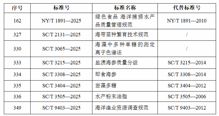 近日,农业农村部印发《中华人民共和国农业农村部公告第976号》,公布了364项经专家审定通过的农业行业标准,自2026年5月1日起实施。由中国水产科学研究院黄海水产研究所牵头主持完成的8项农业行业标准正式获批发布,其中包括水产品加工领域6项、渔业资源管理规范1项及苗种繁育规范1项。以上标准的发布和实施,有利于规范和引导水产品加工、渔业资源管理及水产养殖行业的发展,将对提高渔业管理水平、促进产业可持续发展和规范市场行为等发挥重要作用。