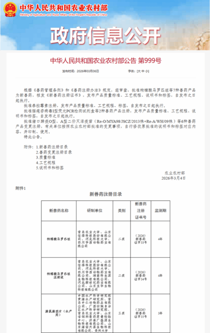3月6日,农业农村部发布第999号公告,由中国水产科学研究院黄海水产研究所水产动物药理与疾病临床团队牵头研制的“溴氯海因片(水产用)”正式获批中华人民共和国三类新兽药注册证书[证号:(2026)新兽药证字35号],这是黄海所获批的首个新兽药注册证书,主要研发人员包括张正、王春元、于永翔、王印庚、荣小军等。公告同步发布了该新兽药的产品质量标准、工艺规程、说明书和标签,自发布之日起正式执行。