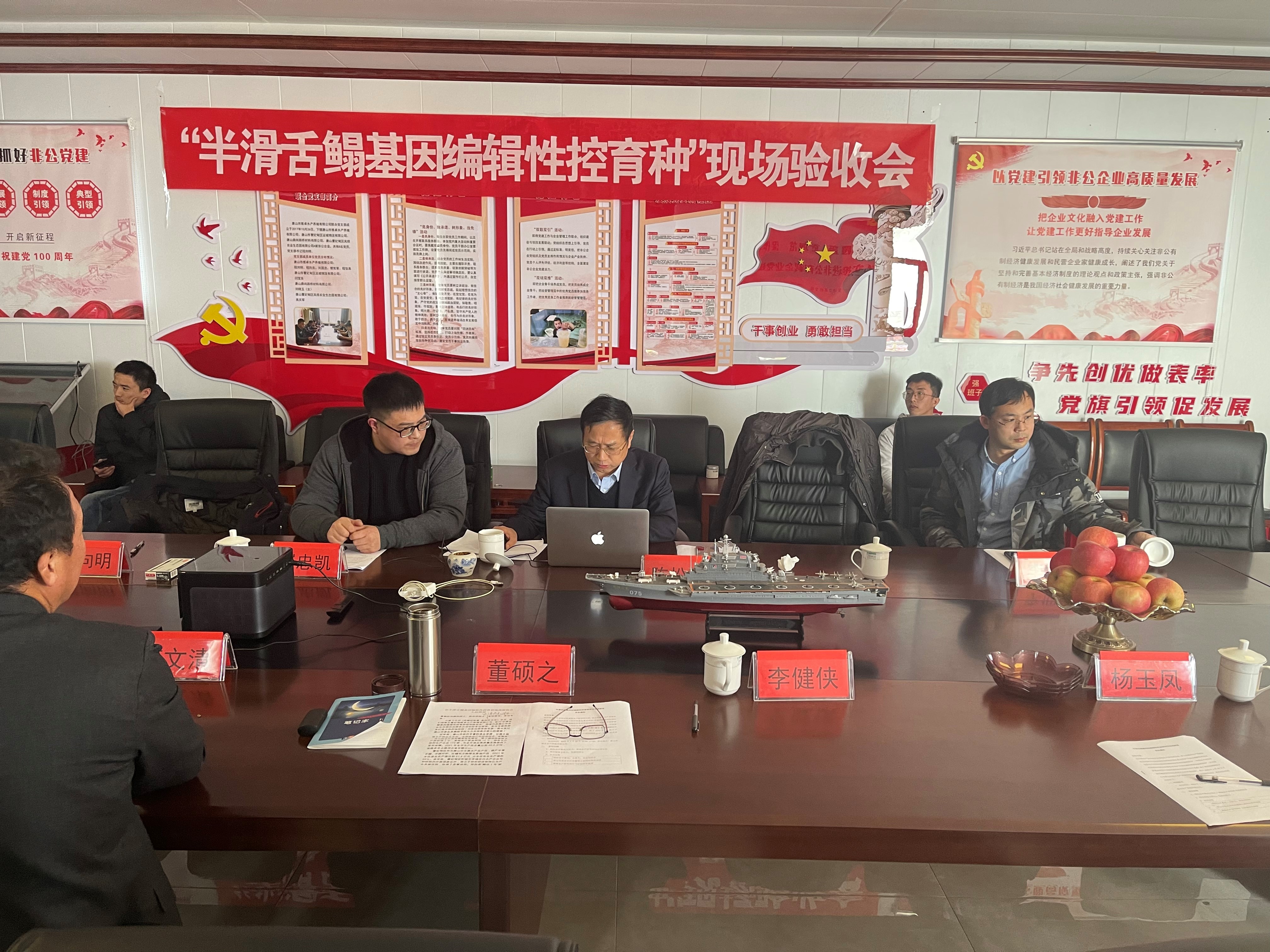 1月26日,由包振民院士、刘英杰研究员、王志勇教授、张继泉教授和苏文清研究员等组成的专家组在唐山市通过线上线下相结合的方式,对中国水产科学研究院黄海水产研究所陈松林院士团队主持承担、唐山市维卓水产养殖有限公司参加的国家自然科学基金重点项目“半滑舌鳎雌性性别决定的分子机制及基因组编辑性控育种的基础研究”、海水鱼产业技术体系“半滑舌鳎遗传改良岗位”项目和中国水产科学研究院基本科研业务费重点项目“半滑舌鳎和鲤基因编辑育种”等项目研制的半滑舌鳎基因编辑F3代快速生长雄鱼进行了现场验收。河北省农业农村厅渔业处周永刚二级调研员、唐山市农牧局副局长董硕之、曹妃甸区政府党组副书记李健侠、曹妃甸区农牧局局长杨玉凤和工信局副局长袁卫国等地方领导出席验收会,黄海水产研究所副所长叶乃好等参加会议。