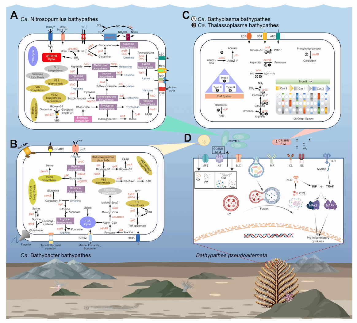 研究团队重建了四个核心共生菌的高质量基因组草图,发现共生氨氧化古菌具有3-羟丙酸/4-羟基丁酸(3HP/4HB)固碳循环途径及氨单加氧酶(amoABC)基因簇,能够氧化宿主代谢产生的氨,驱动有机碳与多种氨基酸、维生素的合成,最终通过多种跨膜转运蛋白供给宿主,从而实现解毒与营养供给的双重功能。新发现的共生菌群(Ca. Bathybacter bathypathes)具有合成血红素、硫辛酸、谷胱甘肽及脂肪酸的潜力,兼具抗氧化应激与营养补给作用。此外,两种柔膜菌基因组高度简化,分别携带II型CRISPR-Cas和3种限制-修饰(R-M)系统,共同为宿主构筑了抵御病毒入侵的生物屏障。