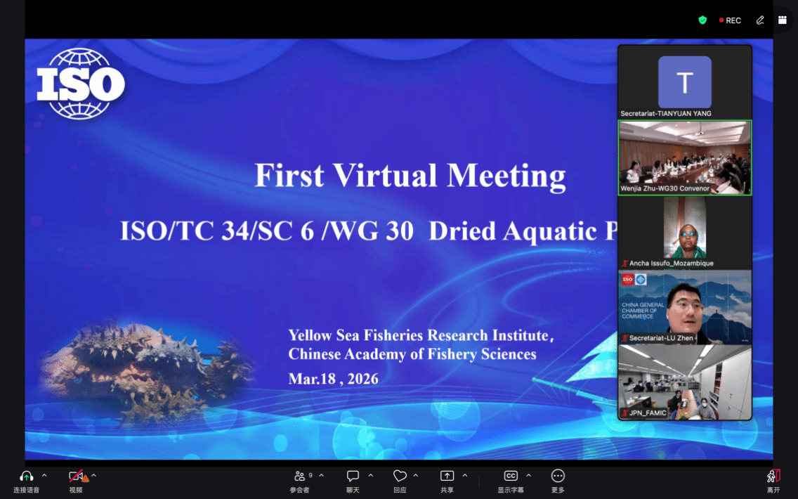 18时至21时,ISO/TC34/SC6 WG 30第一次国际工作组会议以线上形式召开,来自中国、日本、斯里兰卡、哈萨克斯坦、乌干达等国家以及ISO/TC34/SC6秘书处的10余位国际专家参会。会议由WG 30召集人朱文嘉主持,ISO/TC34/SC6委员会秘书长刘振宇出席并致辞。会议围绕ISO/AWI 26260《干海参 产品规范》国际标准草案及新工作项目(NP)阶段收到的各国意见展开讨论,并达成共识,同意推进该草案进入下一阶段。