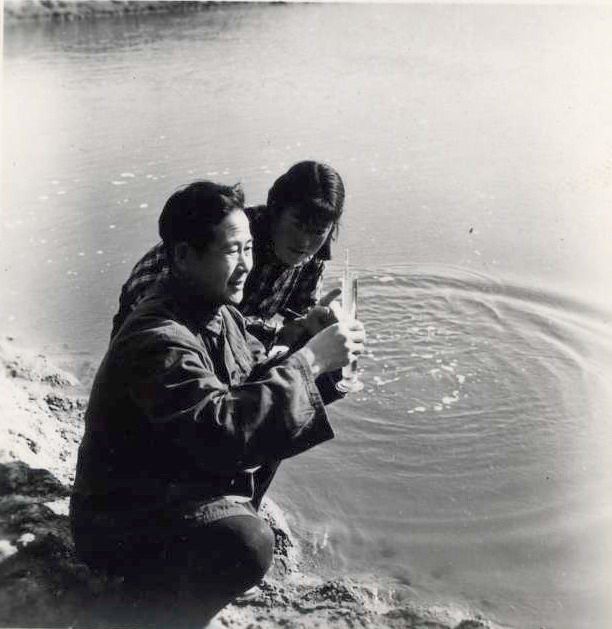 60年代末70年代初,池塘边水质检测和虾苗观察