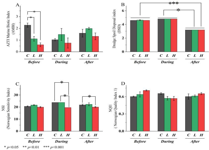 近期,中国水产科学研究院黄海水产研究所滩涂增养殖与生境修复团队在浅海滩涂生态系统健康评价研究方面取得开创性进展。在上级主管部门的支持下,团队在国内率先开展了拖曳泵吸与水冲齿耙耙刺机械化采捕方式对底栖生境的影响研究。研究聚焦山东莱州湾小清河口及辽宁蛤蜊岗等典型滩涂贝类增养殖区,采用基于沉积物大型底栖动物为目标种的AMBI(底栖生物指数)与M-AMBI(多变量底栖生物指数)等评价方法,结合BACI(Before - After - Control - Impact)实验设计,系统解析了不同采捕方式对底栖生态系统健康状况的影响,重点阐明了莱州湾拖曳水冲齿耙耙刺捕捞单环刺螠对底栖群落结构的生态效应。