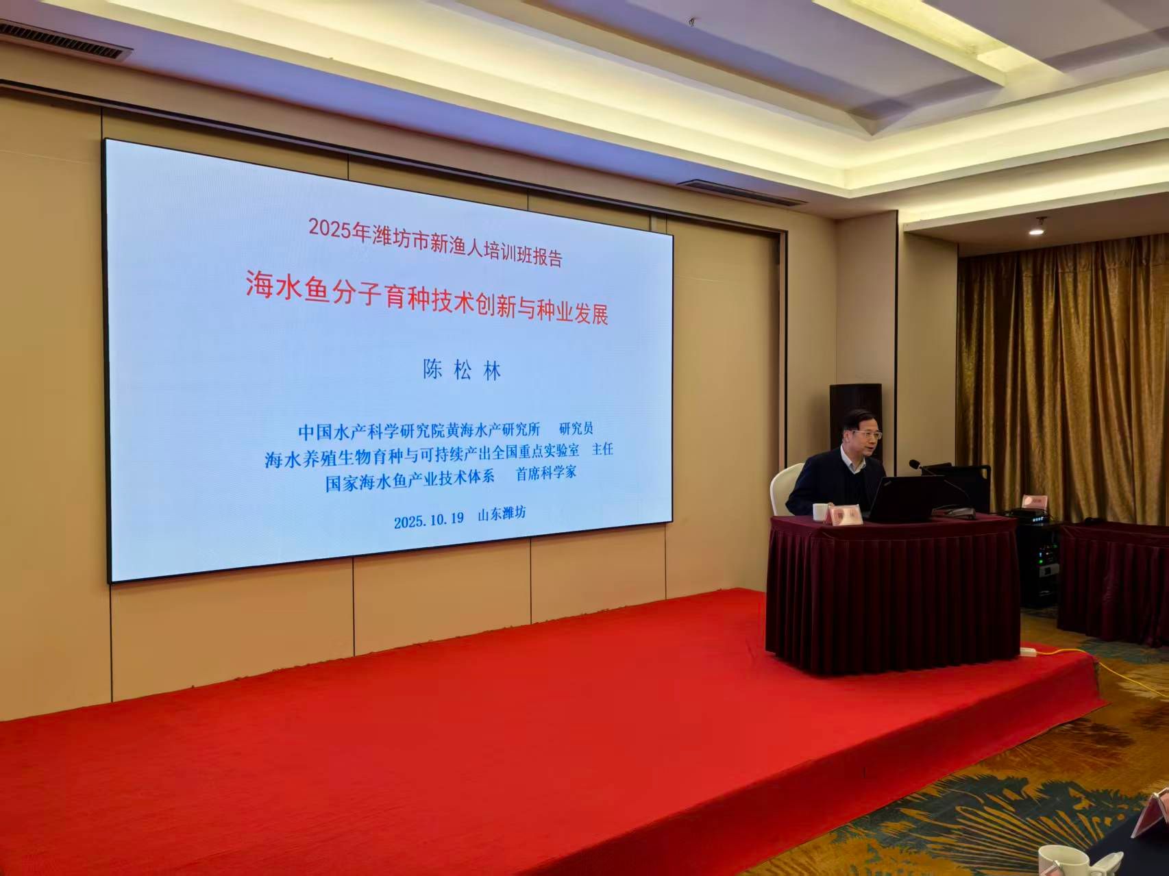 10月19日至20日,由中国水产科学研究院黄海水产研究所、潍坊市海洋发展和渔业局、海水养殖生物育种与可持续产出全国重点实验室共同主办的2025年潍坊市“新渔人”培训班在潍坊成功举办。黄海所副所长荣小军出席开班式,中国工程院院士陈松林受邀讲授培训“第一课”。潍坊市各县市区渔业主管部门分管领导、2025年潍坊市“新渔人”培育人员等60余人参加培训。