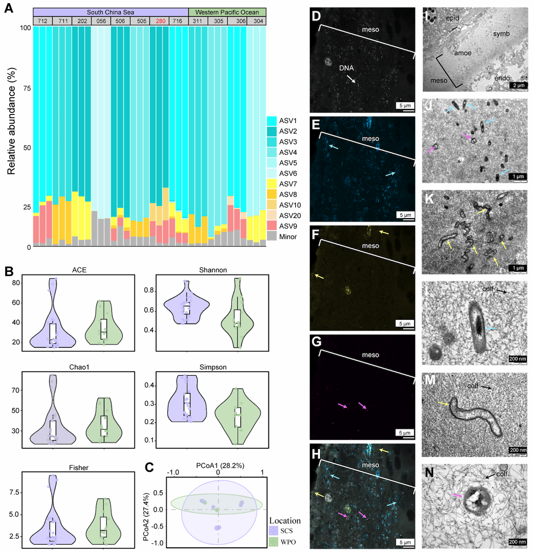 对来自南海与西太平洋跨不同水深与地理区域的14个样本进行共生菌组成与多样性分析,发现共生菌群组成保持简化且稳定的特征,证实了深海黑珊瑚维系了一个独立于周边环境的共生菌群。这种高度简化的共生模式,支持了营养需求驱动下深海黑珊瑚对共生菌进行非随机选择的假说。HCR结果显示共生菌在深海黑珊瑚水螅体中广泛分布,显著富集于中胶层。TEM观察到了典型的氨氧化古菌(AOA)、延伸形态的柔膜菌以及球形的α-变形杆菌等。中胶层的高通透性且富含类吞噬的变形细胞,不仅有利于小分子物质的双向扩散与循环,也为共生菌提供了相对安全的微环境,使物质循环、免疫规避、稳态维持能够在同一组织空间中协同实现。