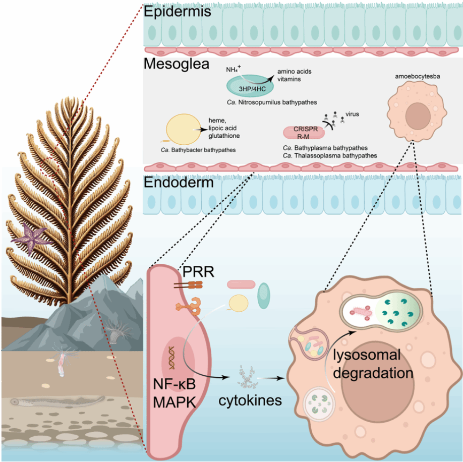 深海珊瑚是构筑深海生态系统三维结构的关键类群,为深海生物提供了重要的栖息地与庇护所。然而,与依赖光合作用提供能量的浅海珊瑚不同,深海珊瑚生存于黑暗、低温、高压及营养匮乏的极端环境中,其能量来源与适应机制一直是深海生态学研究的核心命题。传统观点认为,上层水体沉降的“海雪”是深海珊瑚的主要营养来源。然而,在寡营养的深海环境中,此类外源性能量输入是否足以支撑其完整的生命活动,尚存争议。近年来,研究推测其共生菌可能在营养补给、能量代谢与环境适应中发挥关键作用,但相关研究局限于共生菌群落组成描述,对宿主与共生菌之间具体的分子互作机制(物质交换、免疫识别与协同适应等)仍缺乏系统性的实验证据与遗传层面上的机制解析。